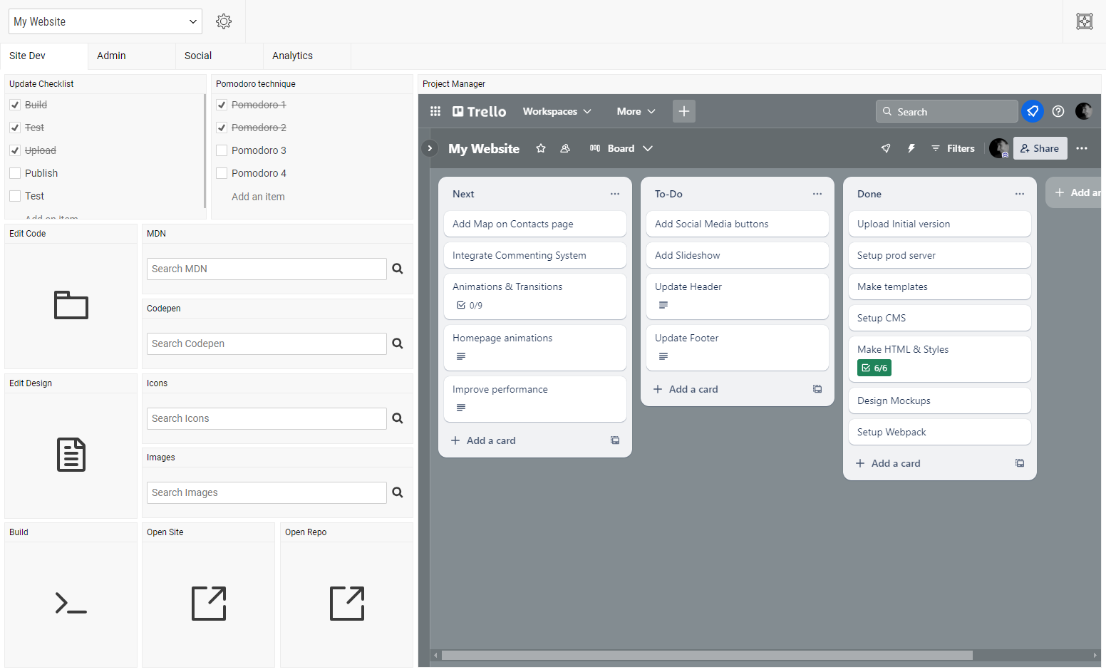 Project Manager - Webpage Widget embedding a project manager web app (Trello Board in this example).